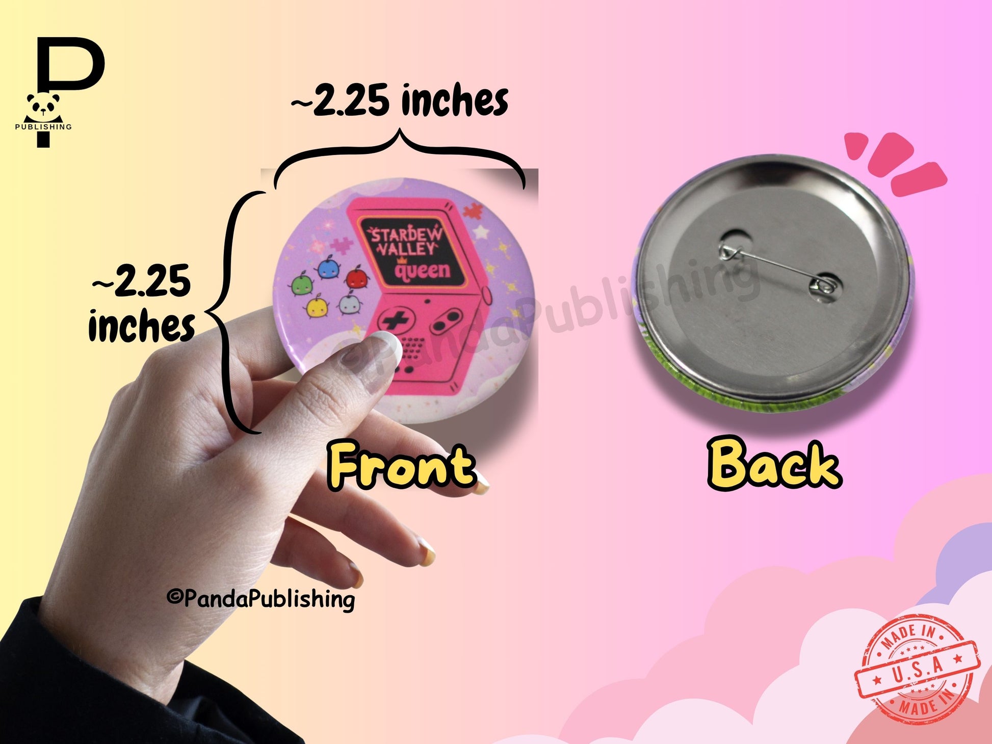 Each button measures 2.25" x 2.25", and made out of high-quality metal and durable pin-back for secure attachment. Ideal for decorating backpacks, jackets, hats, and more.