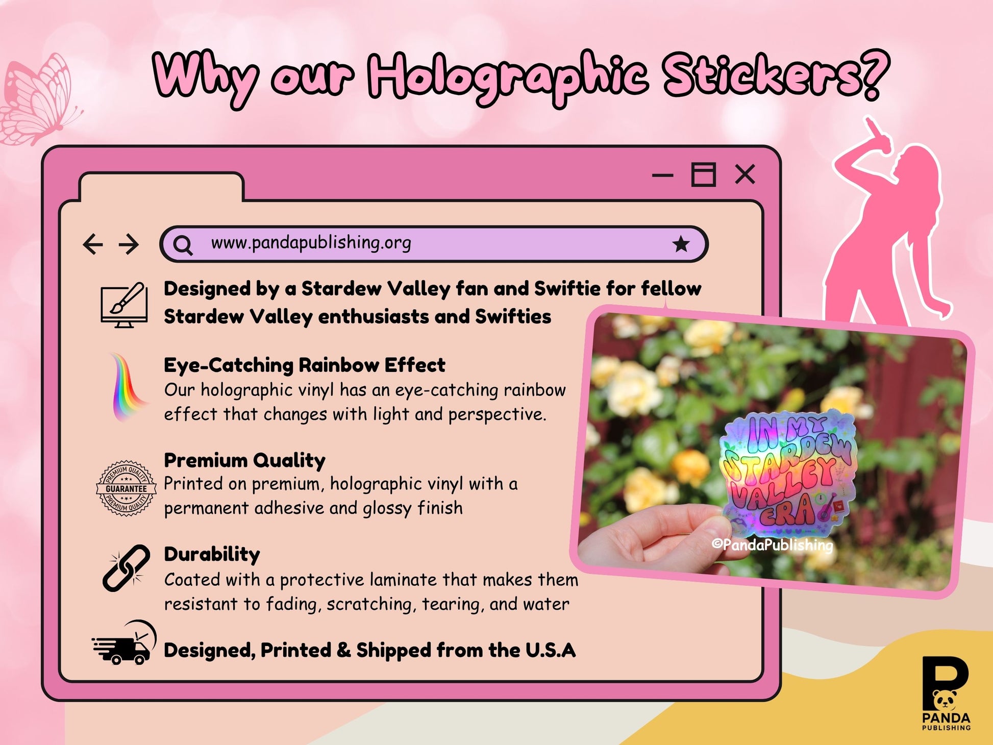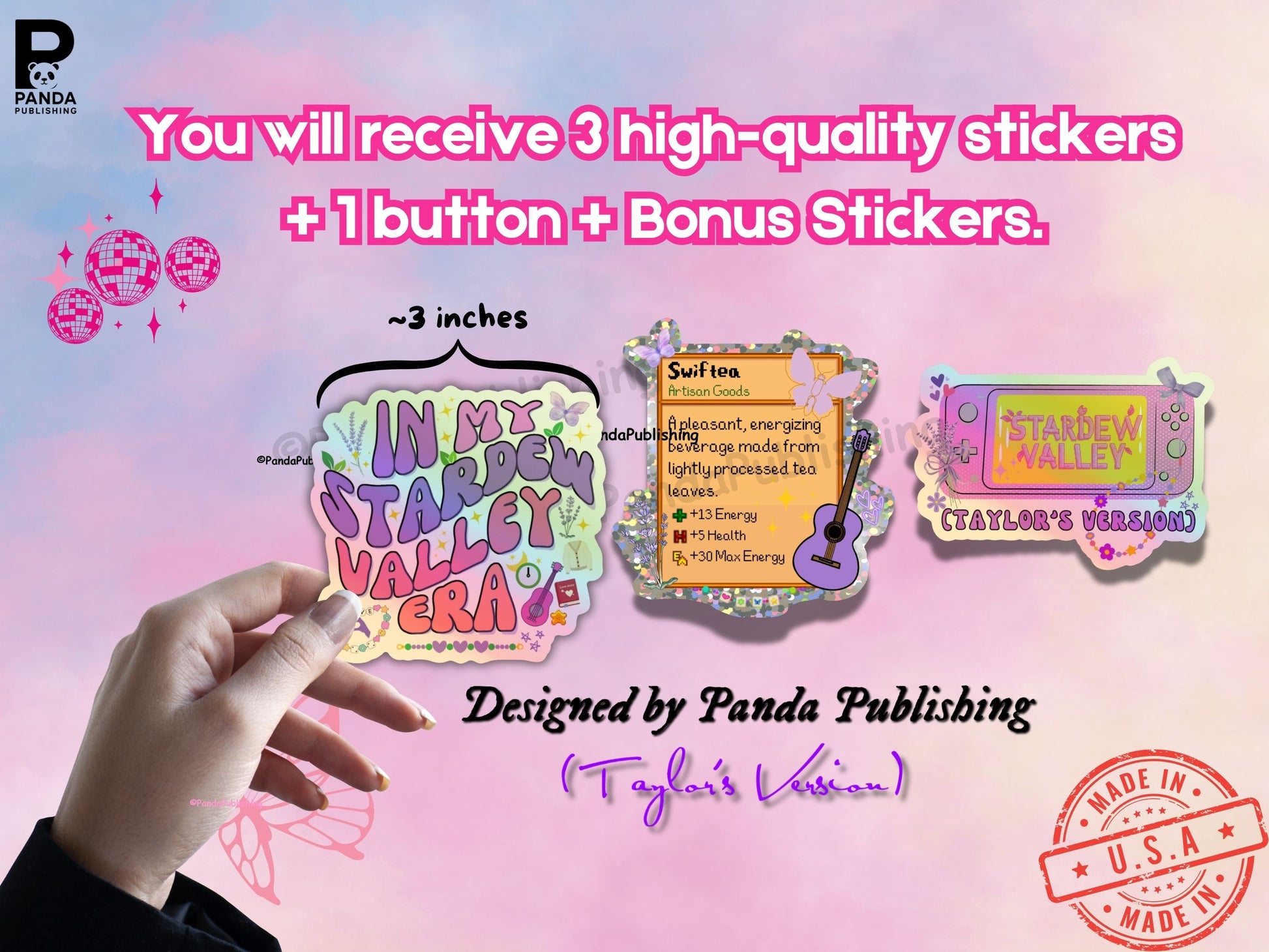 Calling all Swifties and Stardew fans! This special-edition pack of 3 holographic stickers and a button blend the charm of Stardew Valley with the vibes of Taylor Swift eras. Add a little shimmer to your everyday items because we never go out of style ✨